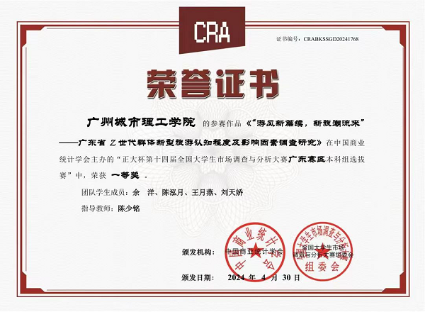 本网讯(记者 黄凤娟 余洋)6月5日,我校国际商学院教师陈少铭及其指导的学生团队收到由中国商业统计学会颁发的“正大杯第十四届全国大学生市场调查与分析大赛广东赛区本科组选拔赛”一等奖证书。